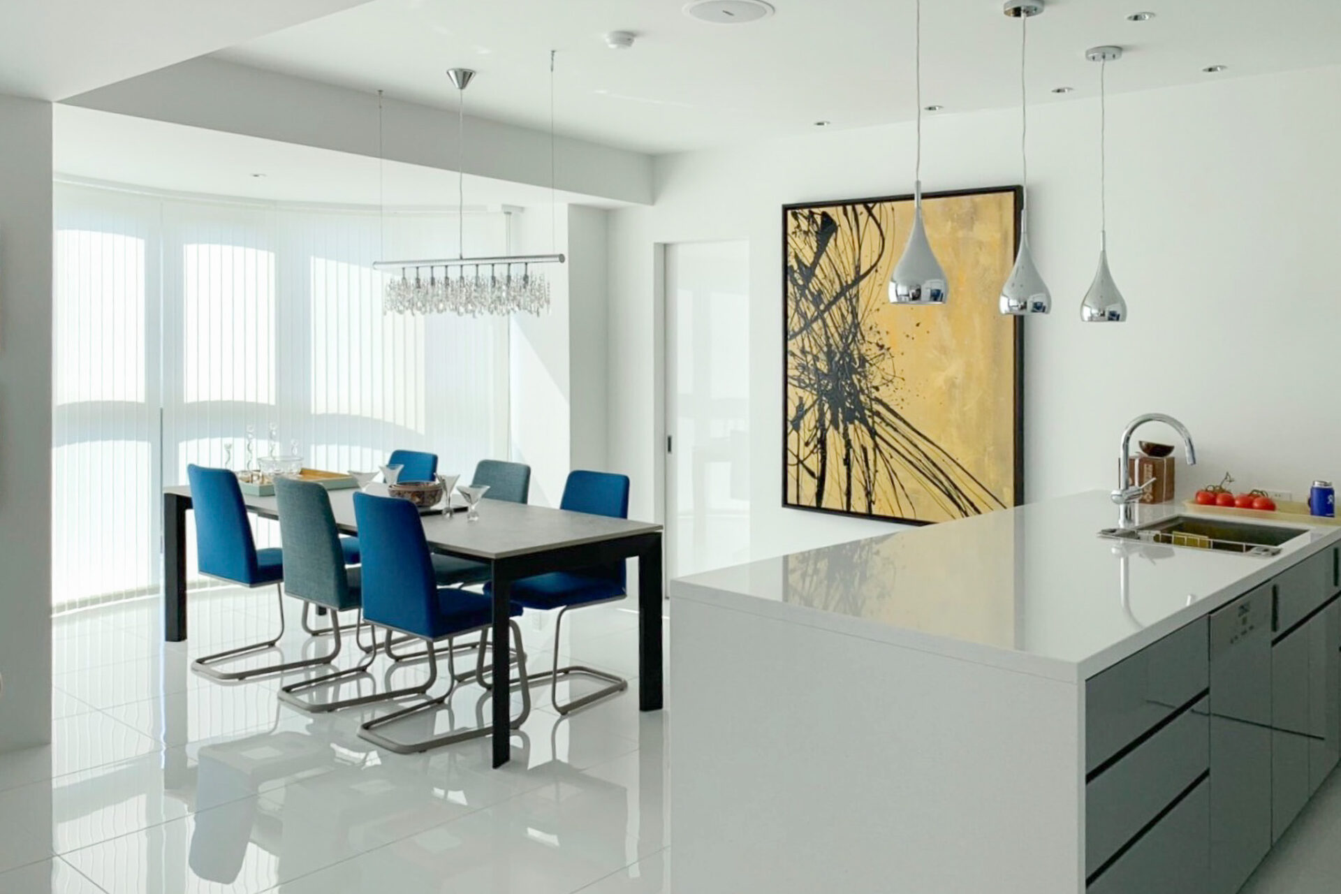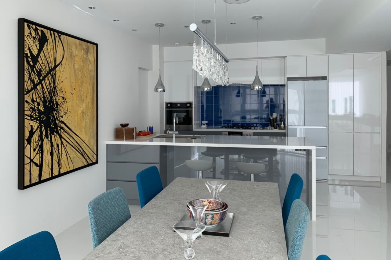 The countertop material and size were absolutely non-negotiable. We wanted quartz, and as large a slab as possible without seams. During planning, it was considered reasonable to bring it in as two pieces, but that would have left a visible seam, which we strongly wished to avoid. Madre made it possible by arranging for a large crane to lift the countertop in through the balcony—an incredible solution.