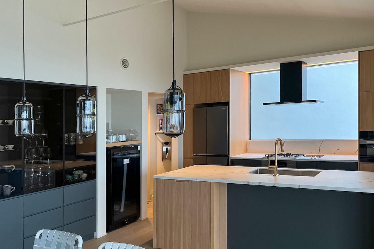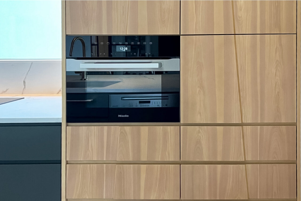The wood-grain cabinet doors were chosen carefully to harmonize with the ceramic countertop and the architecture.