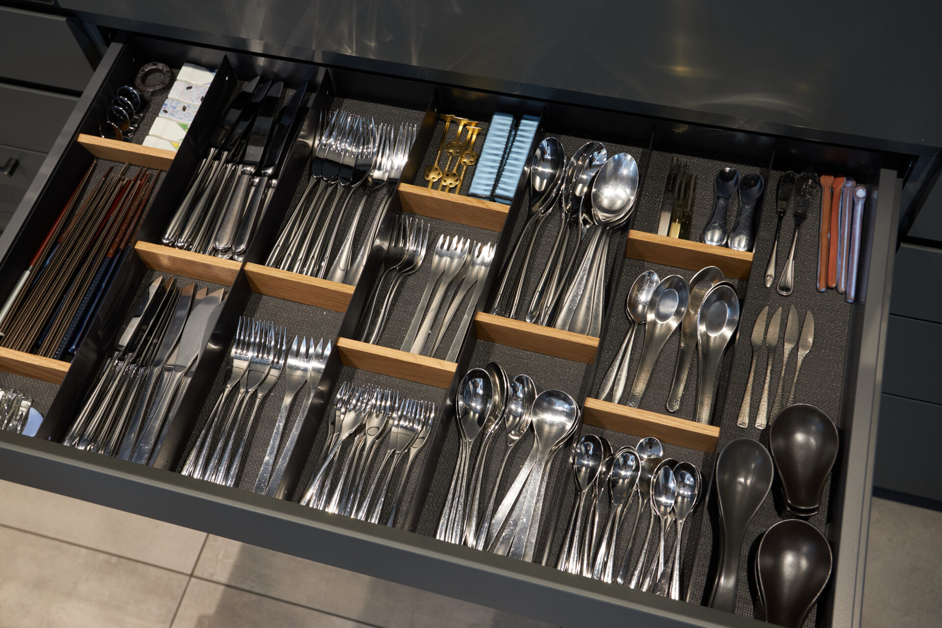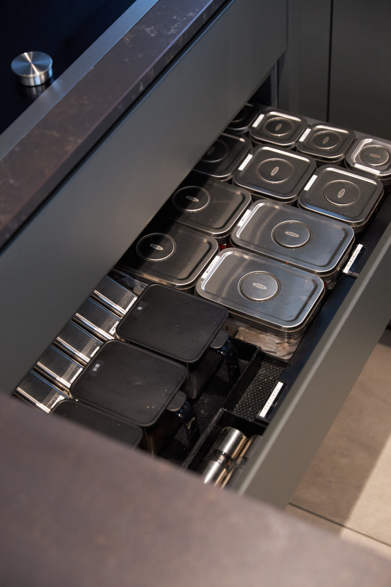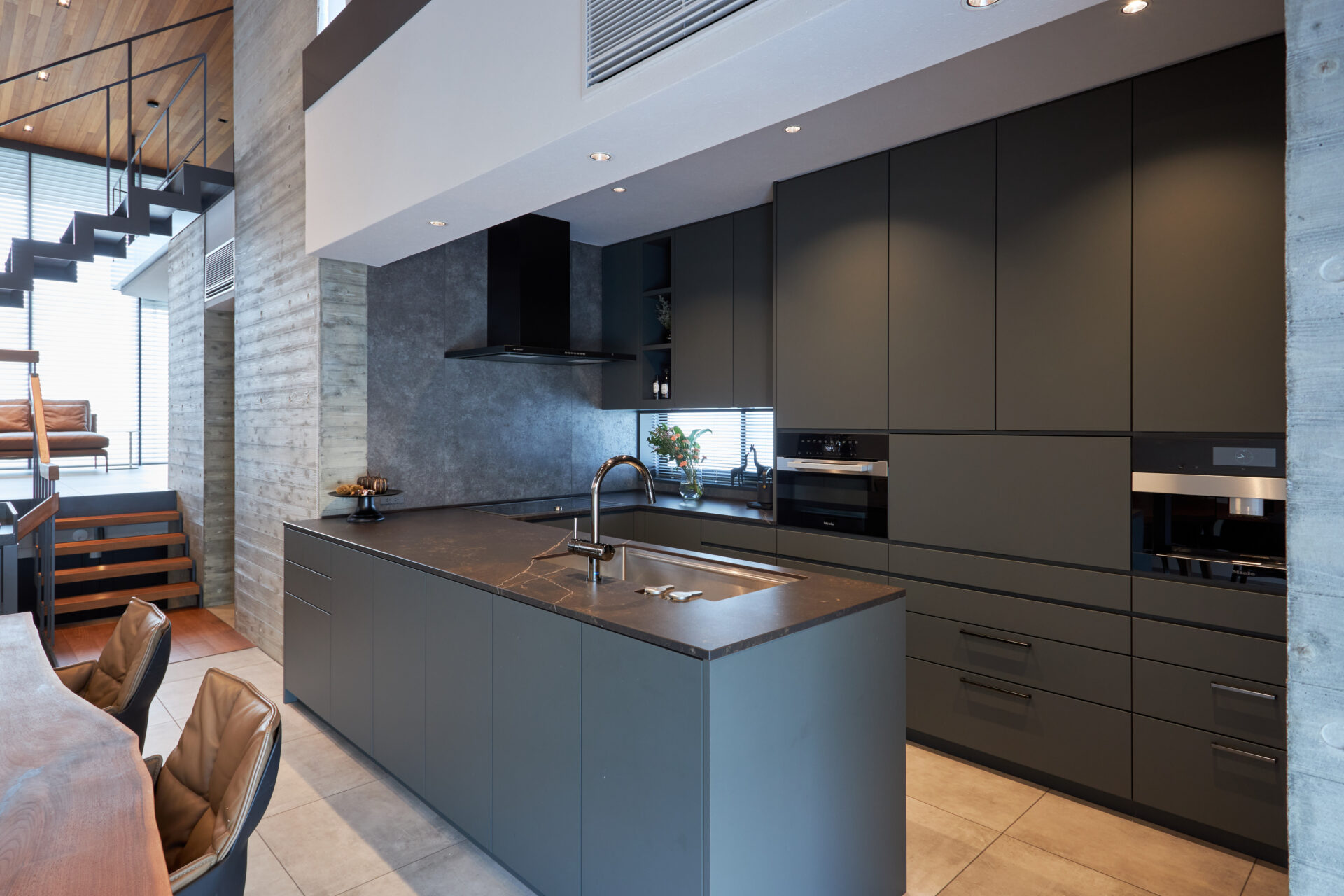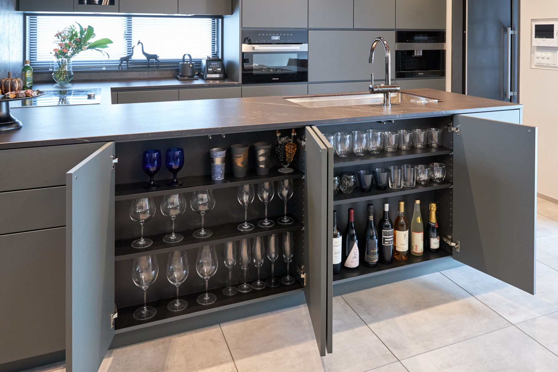 天板にはダークなセラミックを選定。扉も建築と合わせシックな色合いを選び、一見シンプルですが、実は扉を開けると、そこは数ミリの狂いもなく、たくさんの調理器具や食器、カトラリー、調味料類などが整然と収納できるよう設計されています。
