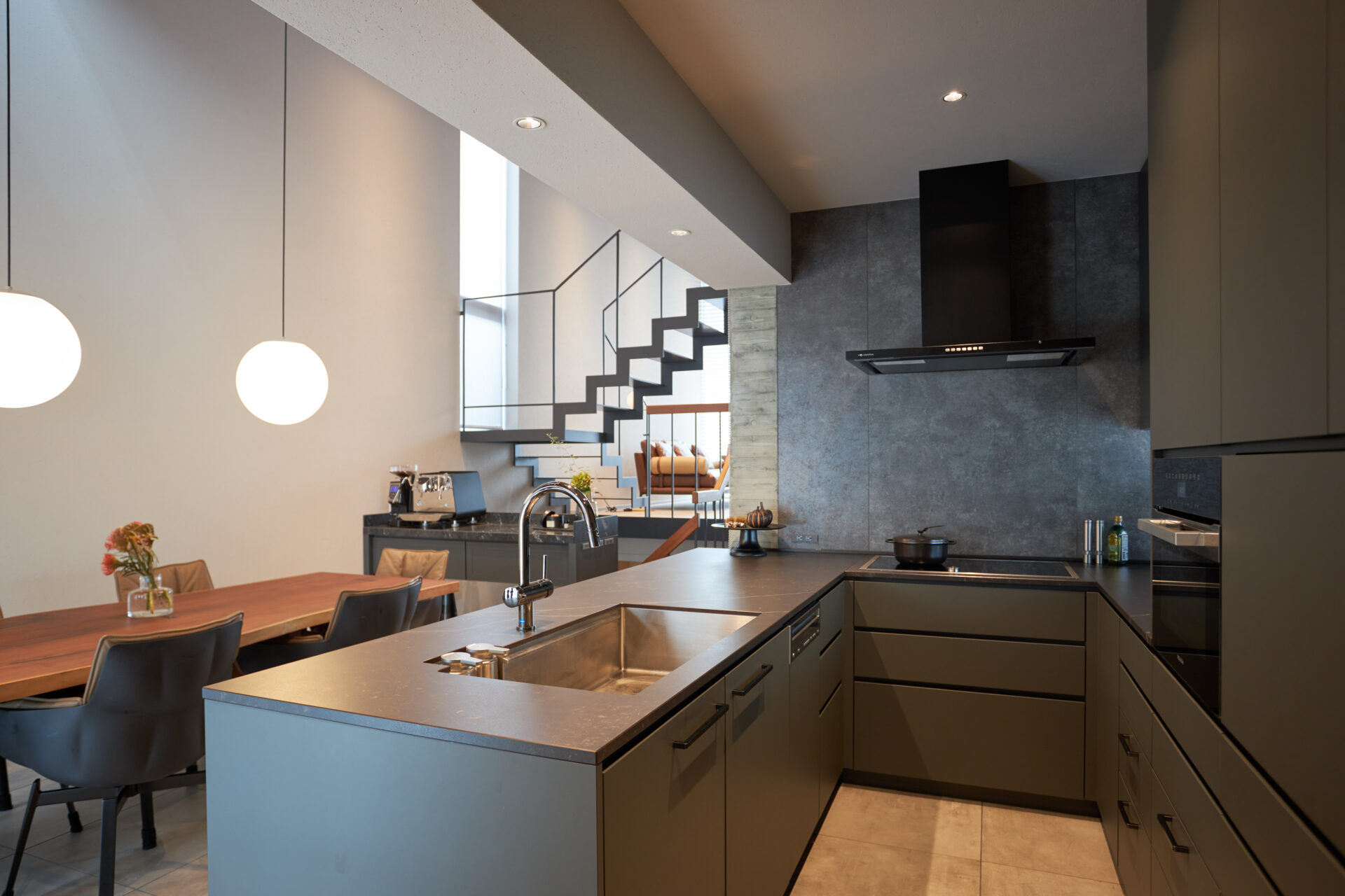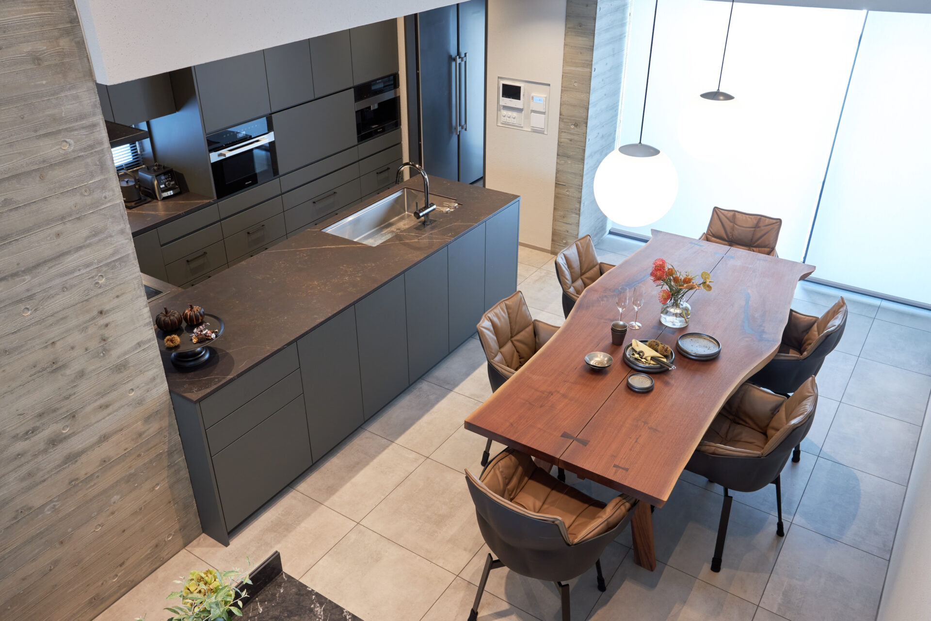 また、MieleのコーヒーマシンとLIEBHERRの冷蔵庫は、調理中でもご家族がアクセスしやすい位置に配置しました。