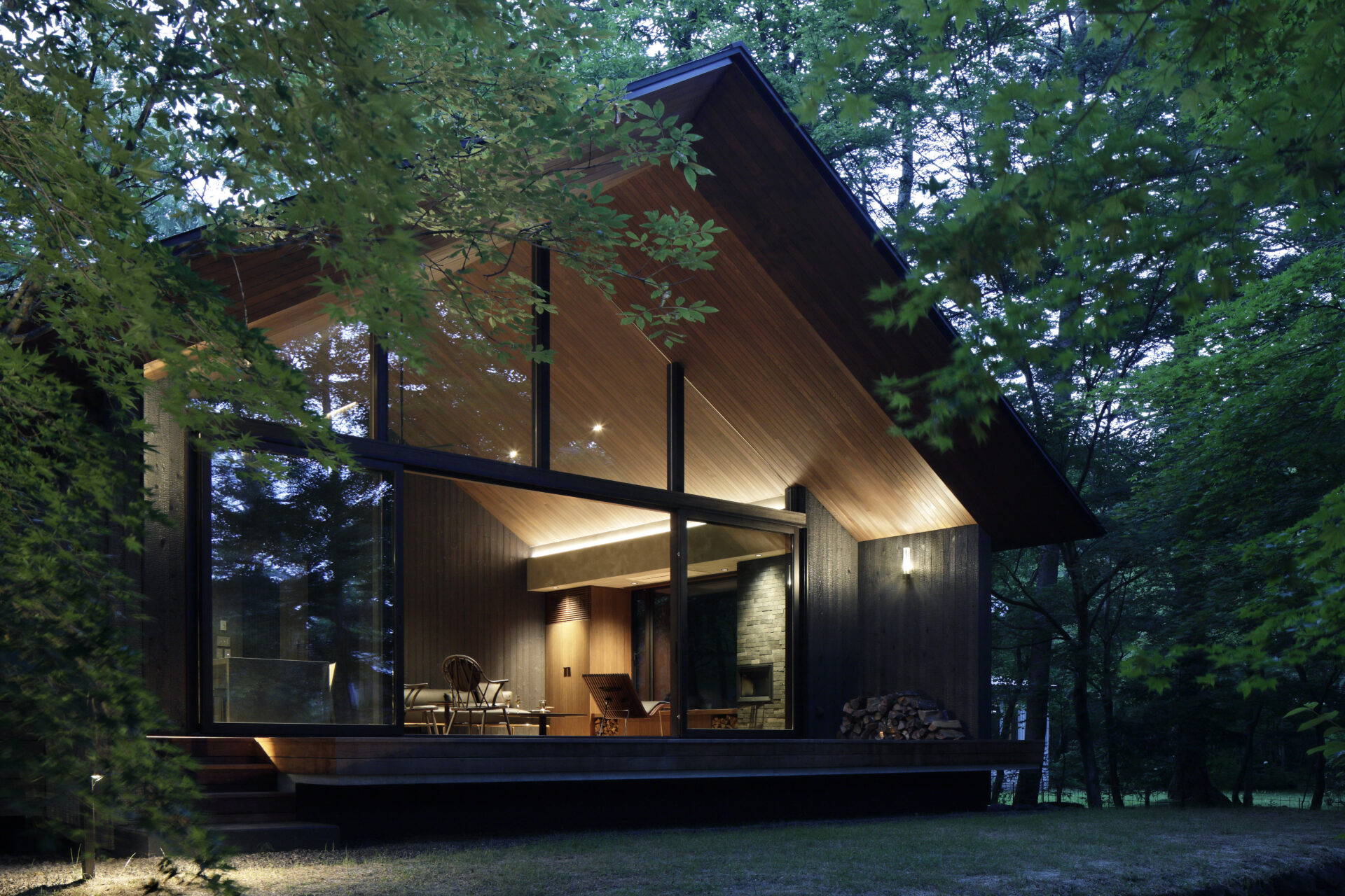 周囲の木々に溶け込むように佇む軽井沢の別荘。外部の自然を室内へ緩やかに取り込む大開口の窓を中心に、左右のキャビネットが美しくシンメトリーに配置されたバックセットと、4mのダイニングテーブルと一体化したペニンシュラキッチンを設置しました。