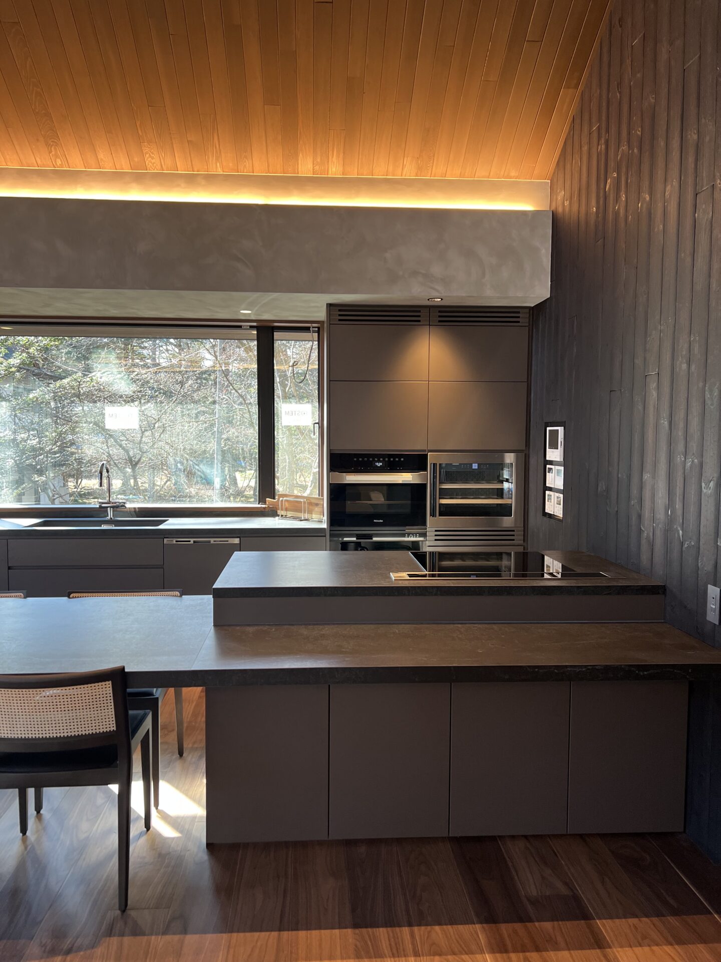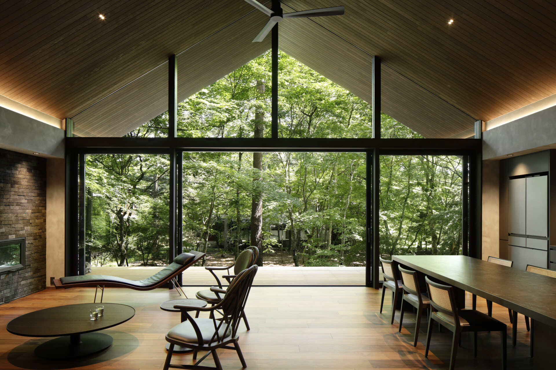 A Karuizawa villa blending seamlessly with the surrounding trees. Centered around large windows that gently draw the exterior nature indoors, we installed a peninsula kitchen integrated with a 4-meter dining table, flanked by beautifully symmetrical back-set cabinets.