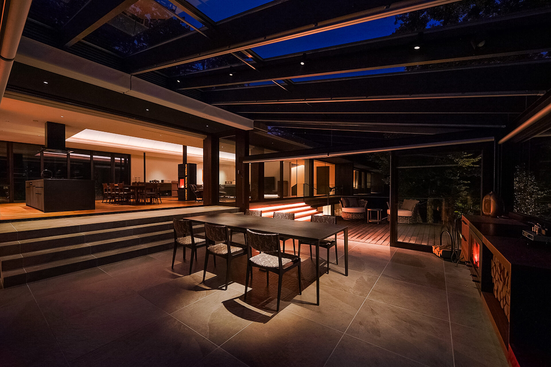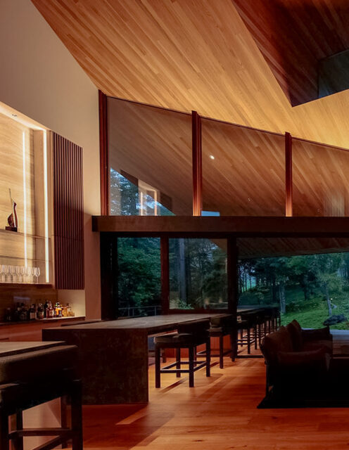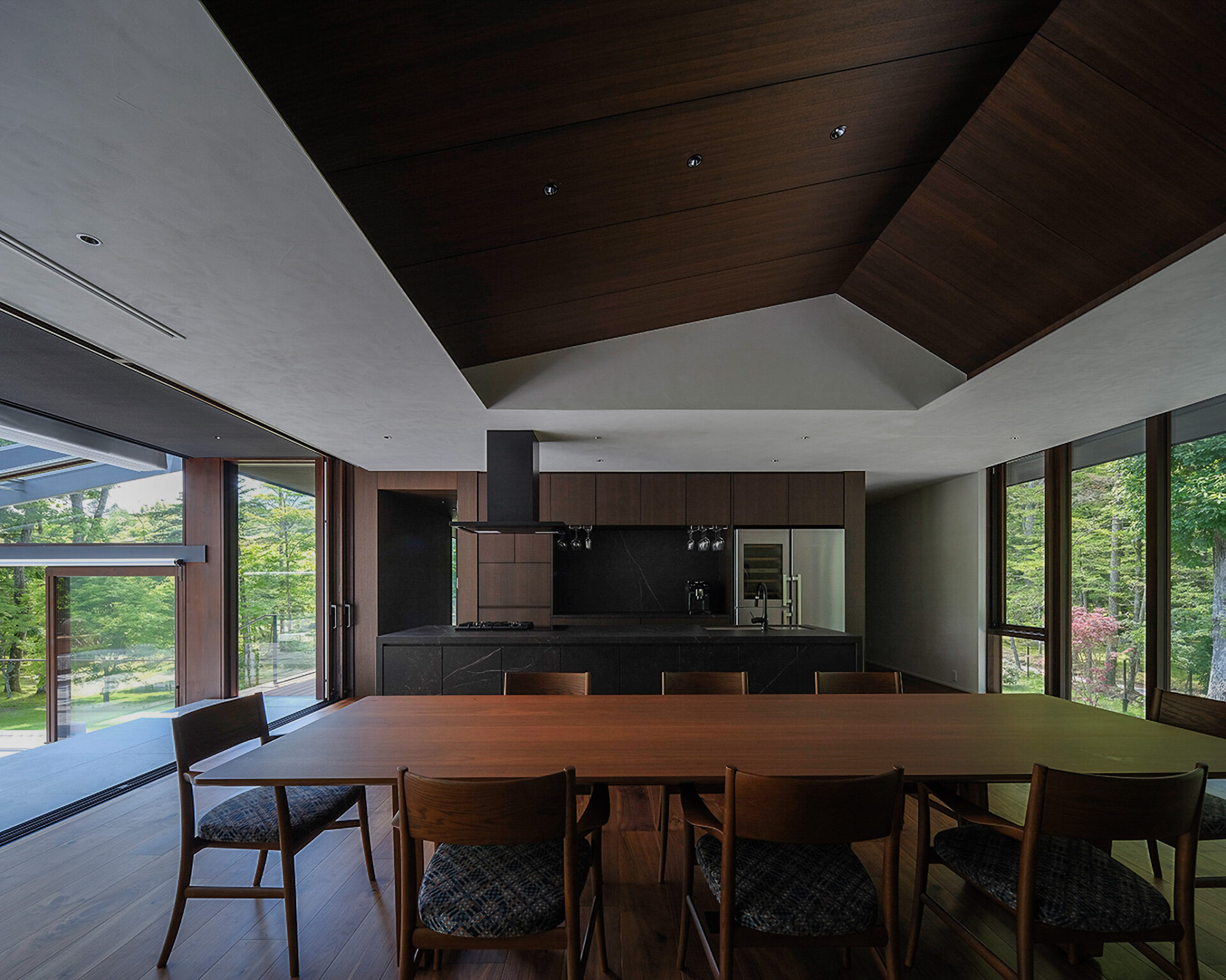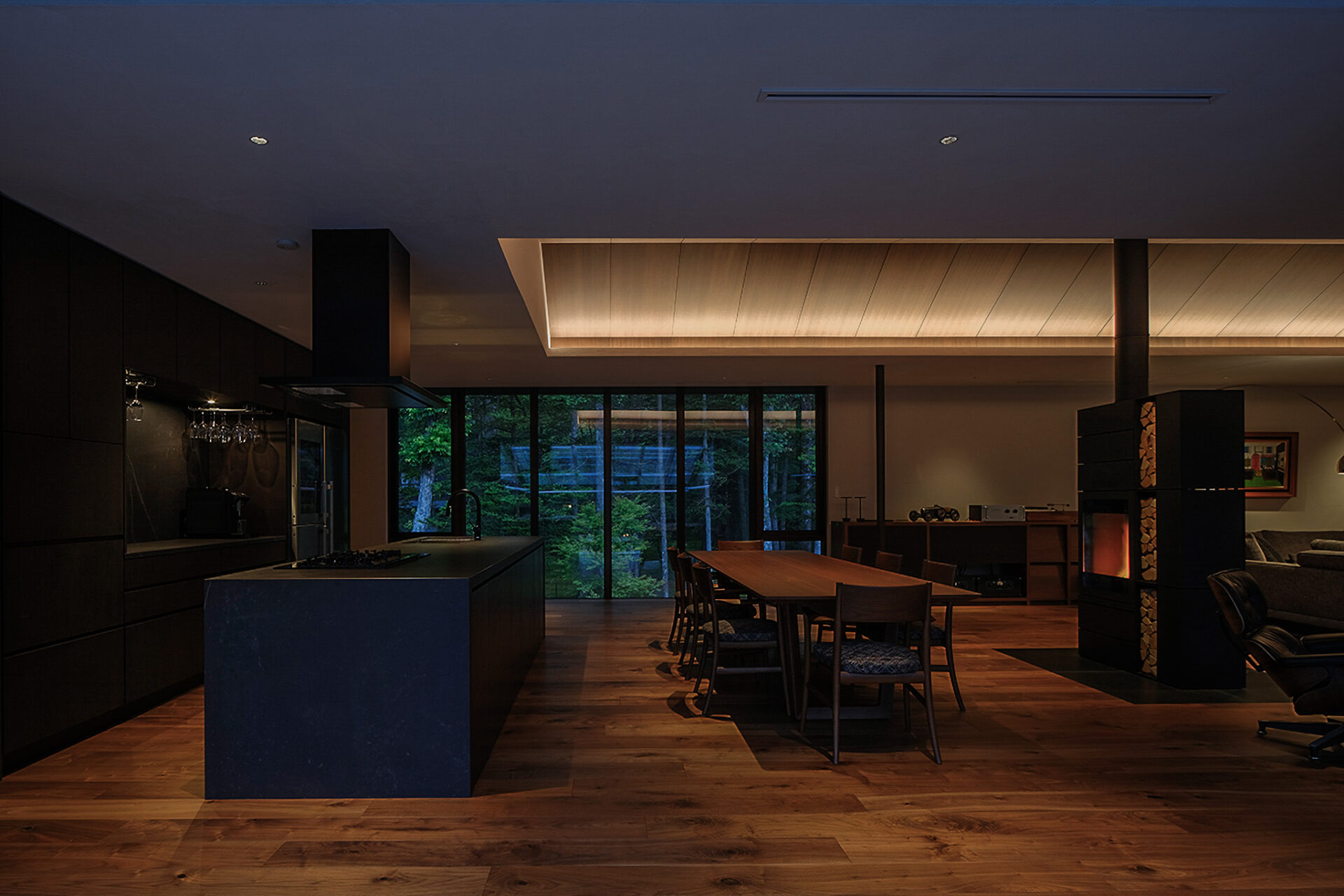 The island kitchen is clad in ceramic, creating a beautiful design with a sense of weight and presence. Equipped with a five-burner gas cooktop, it offers professional-grade facilities suitable even for chefs, while concealed storage and a rear pantry ensure that kitchen appliances remain neatly out of sight.