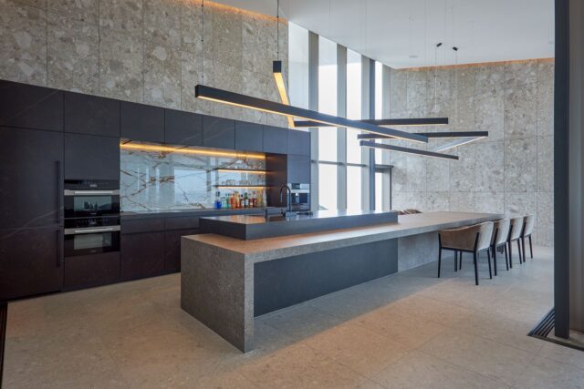 アイランドキッチンをセラミックで包み、重厚感のある美しいデザインに。