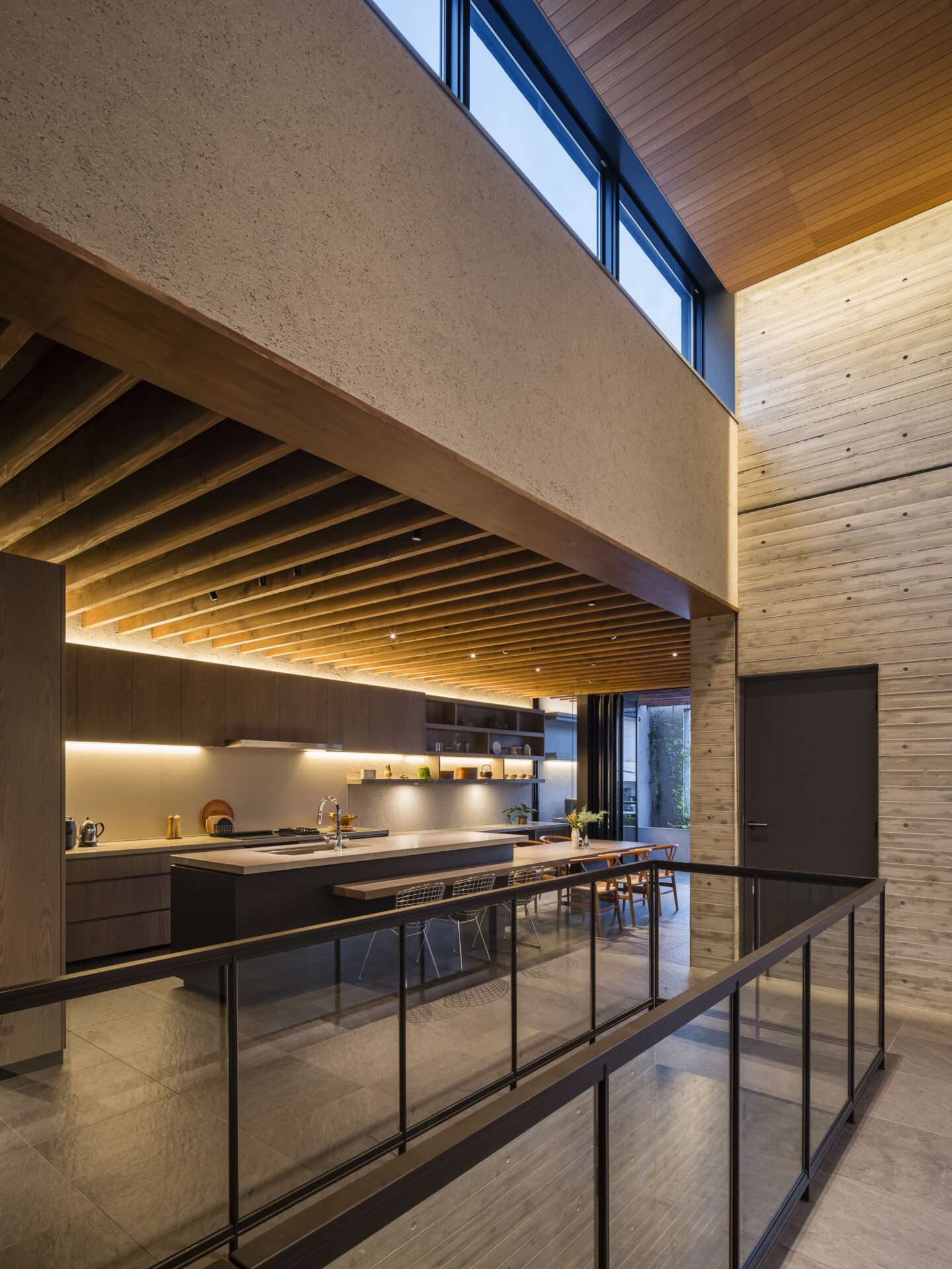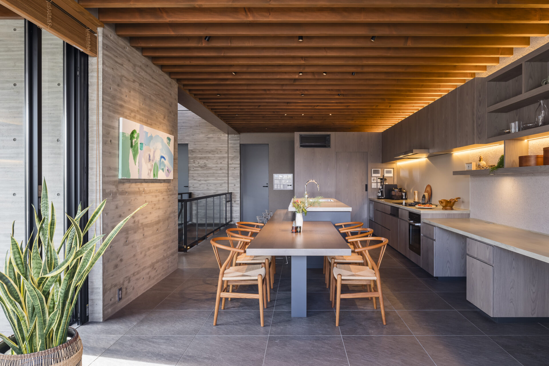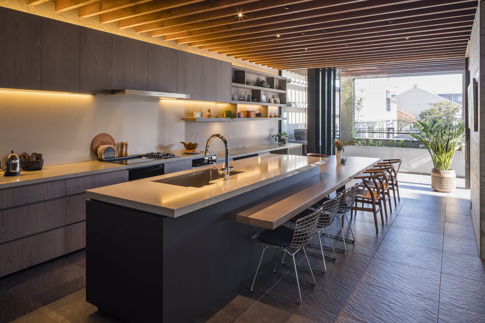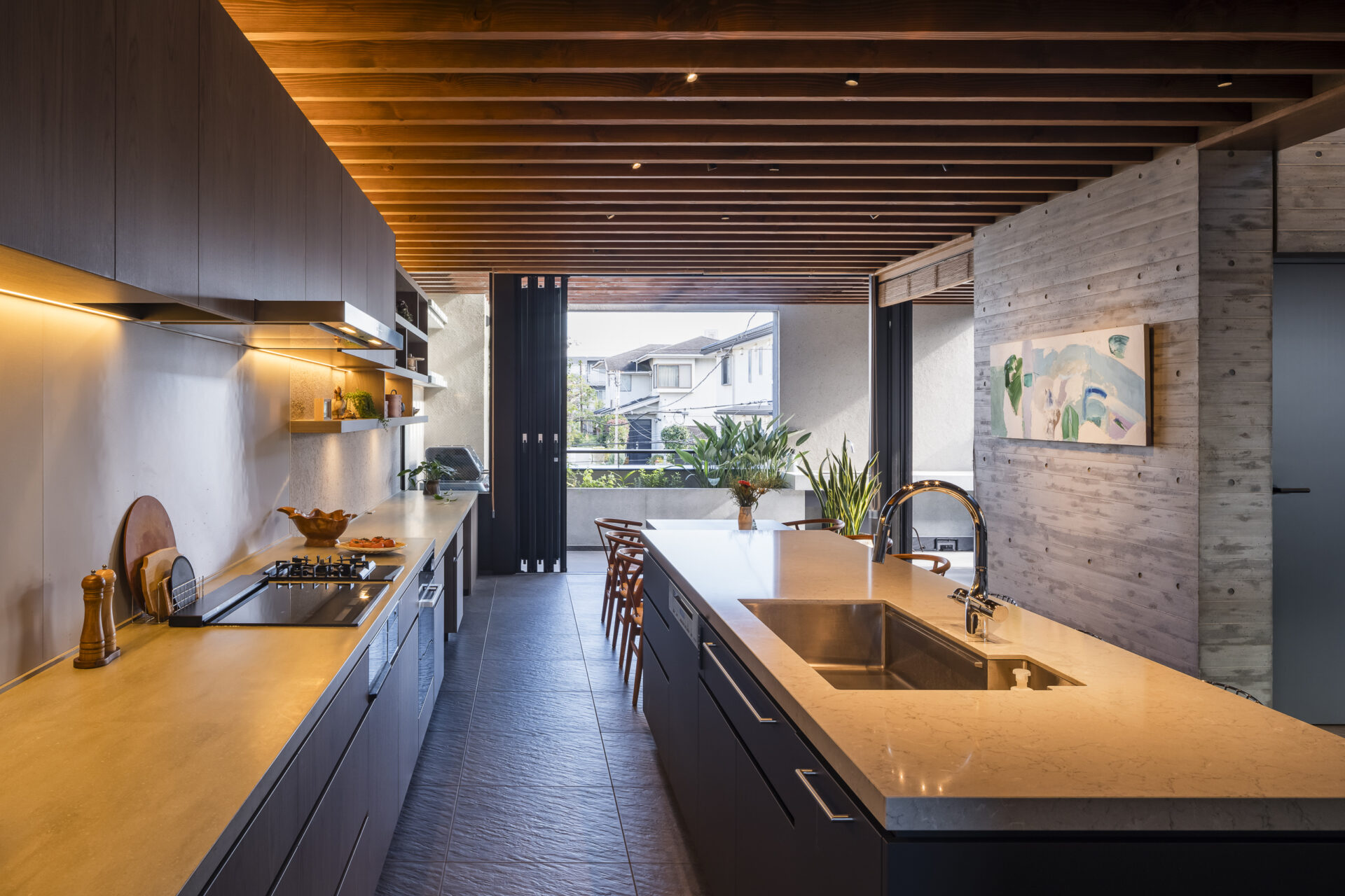 We created the kitchen, a children’s space adjacent to it, and custom air-conditioning louvers. The design was conceived to harmonize with the architectural beams. The kitchen features a Japanese-made IH cooktop with a built-in grill, complemented by a single-burner gas cooktop, all covered by a 120 cm-wide range hood. On the island side, a sink and dishwasher are installed.