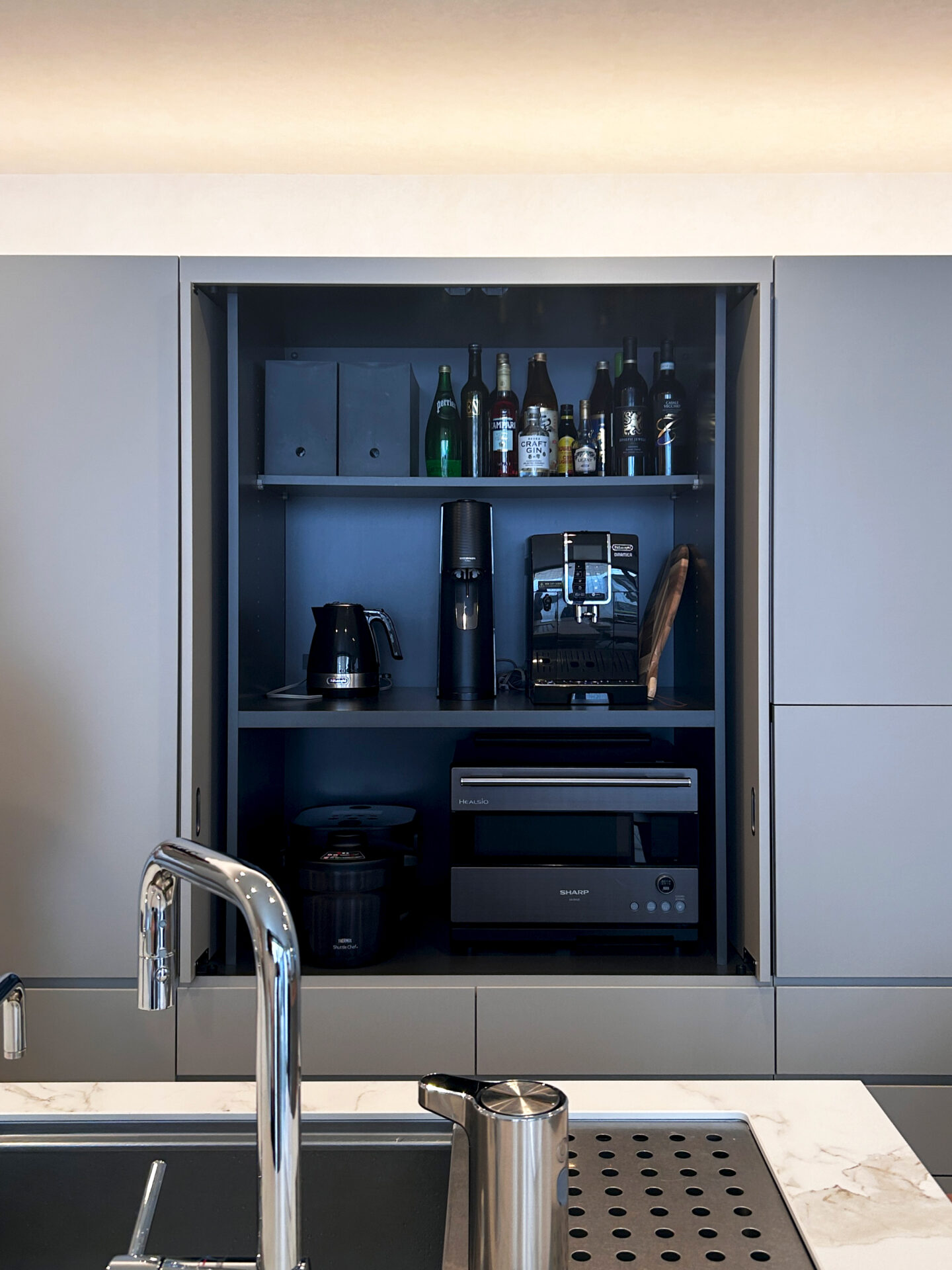 We created the kitchen, vanity, and full-height back cabinetry. The tall storage unit neatly houses the pantry, appliances, and tableware.