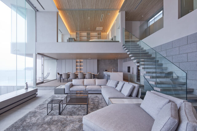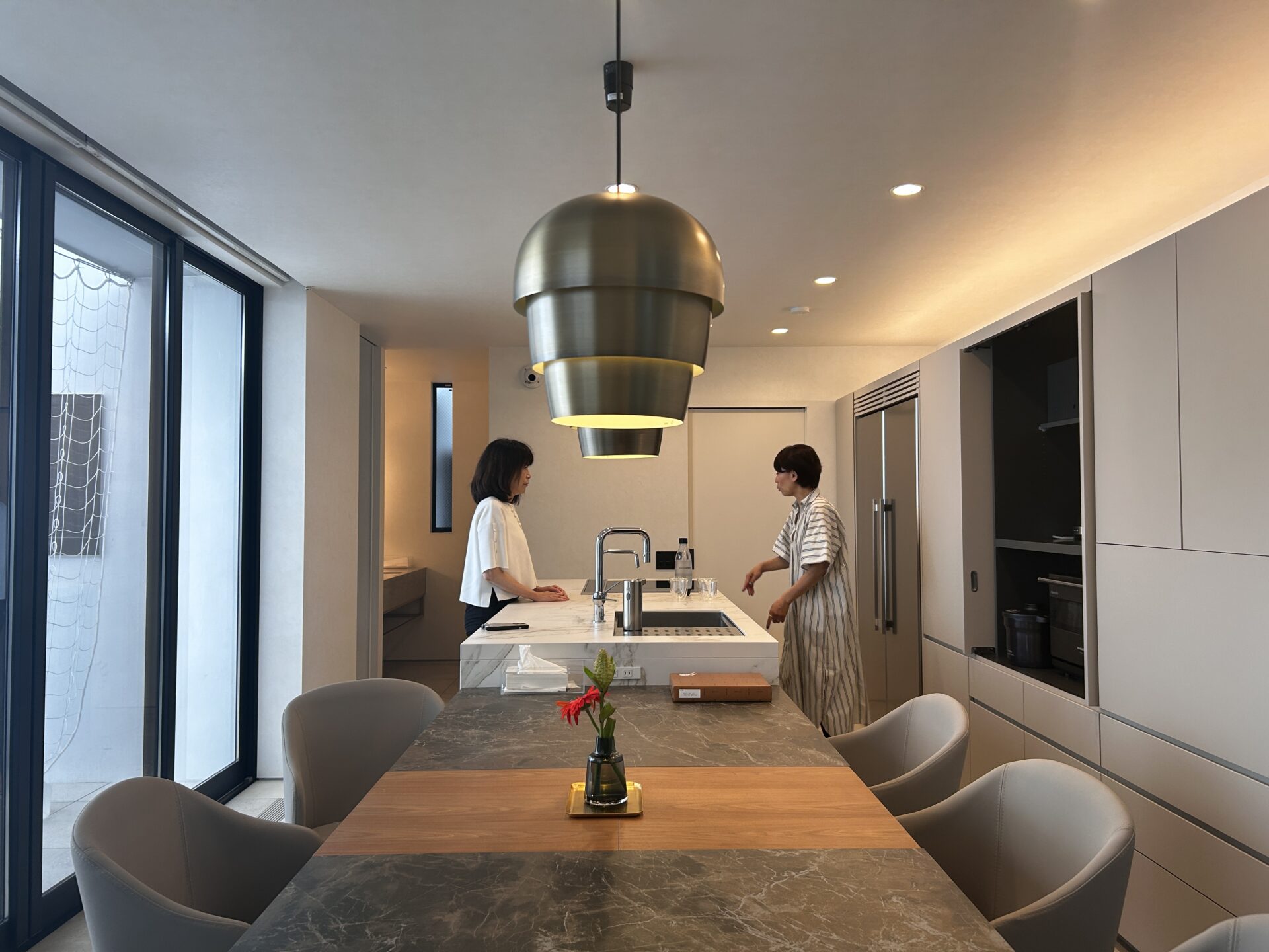 キッチン、洗面、フルトールのバックセットを制作。パントリー、家電、食器などをすべてフルトール収納に収めています。アイランドキッチンは下引きの換気扇を装備。カウンターはセラミック。