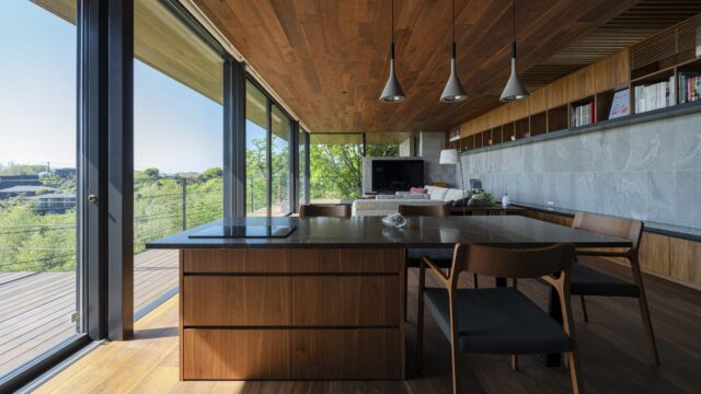 The island kitchen is finished with a ceramic countertop and equipped with a downdraft ventilation system.