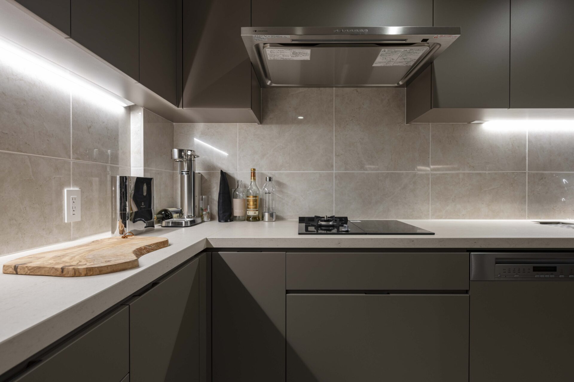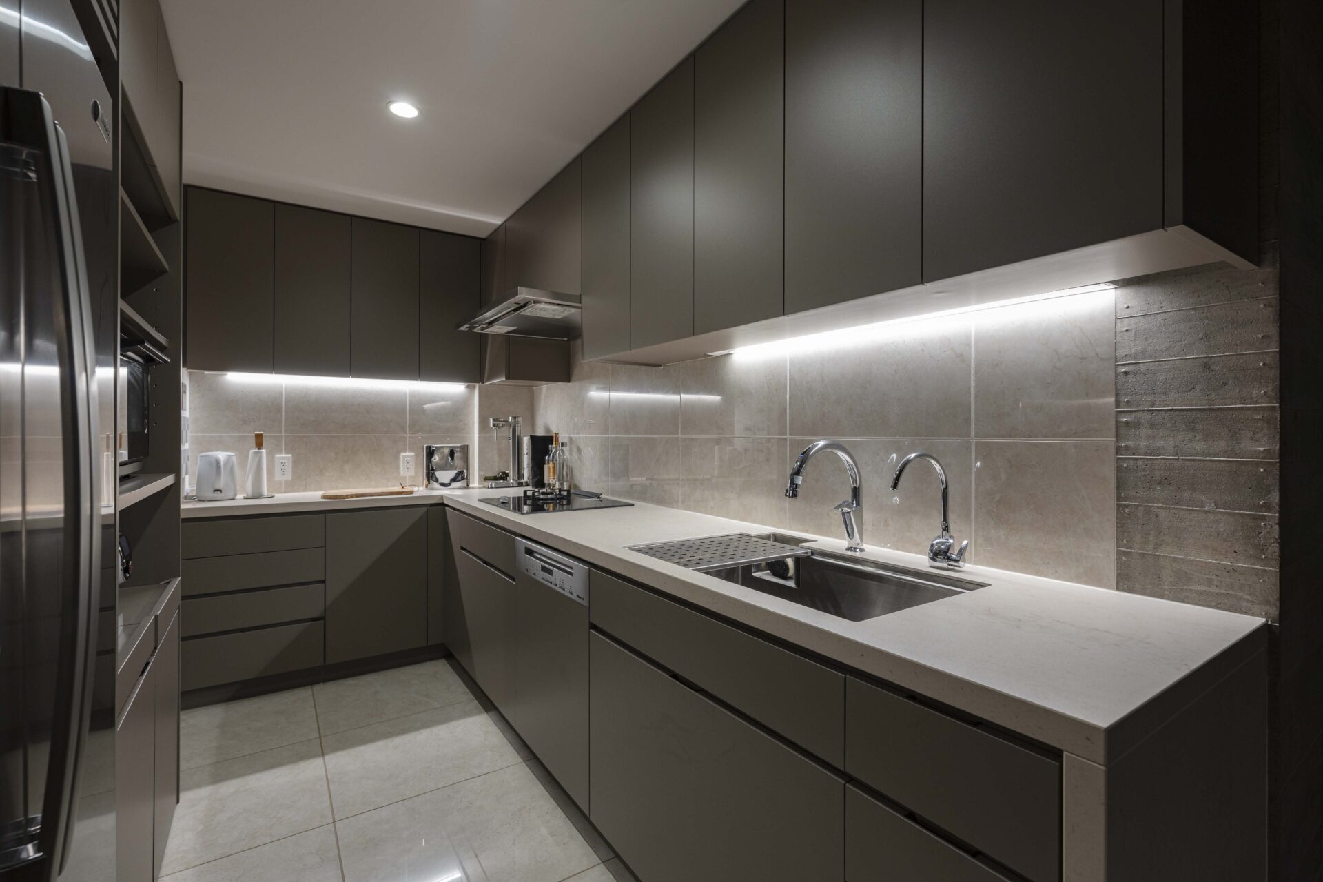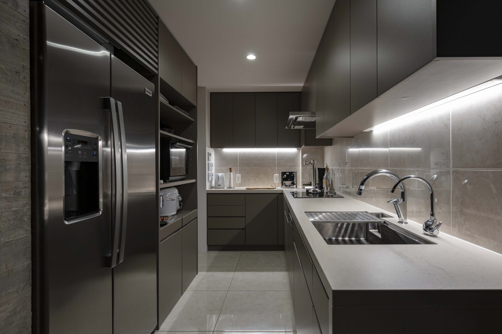 We created a Silestone dining table and a semi-open ceramic kitchen. The L-shaped kitchen is equipped with both gas and IH cooktops, while the dining table also includes an IH unit for warming dishes at the table. The sink features dual faucets—one with a water purifier and the other a touchless design.