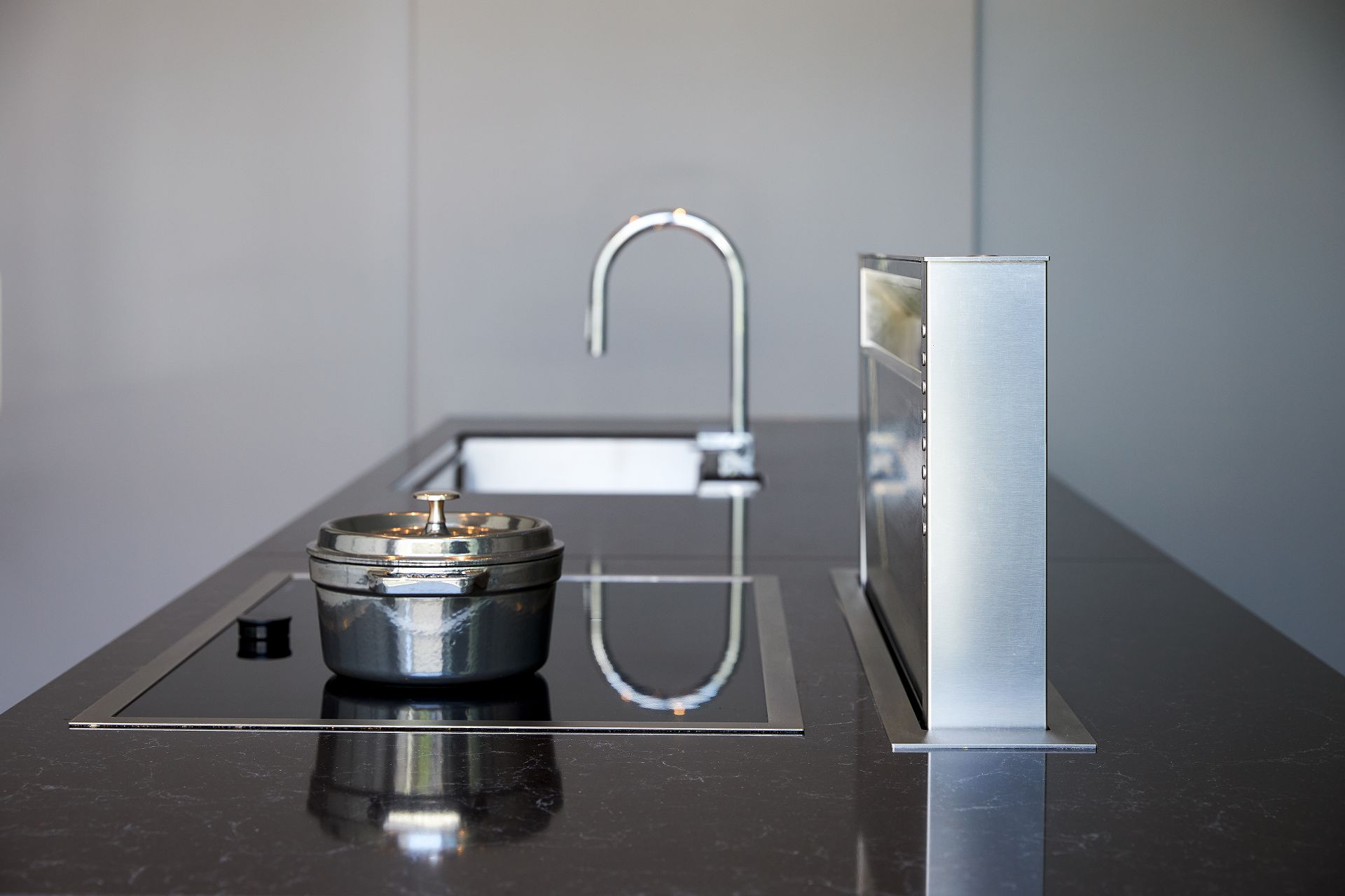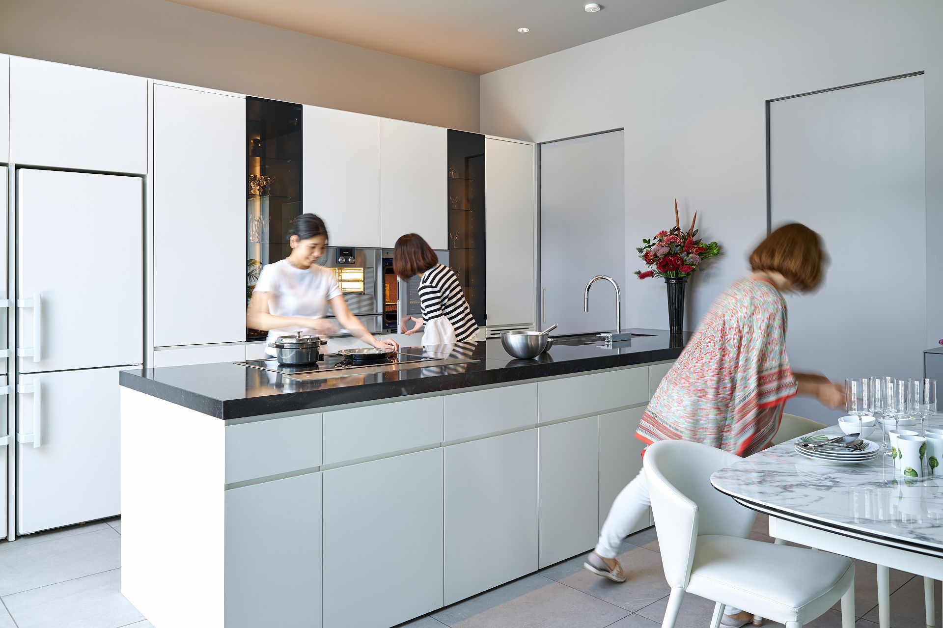 アイランドキッチンとバックセットを制作。調理家電はGAGGENAUで統一されています。